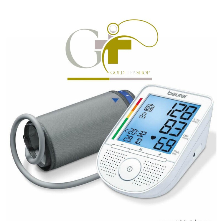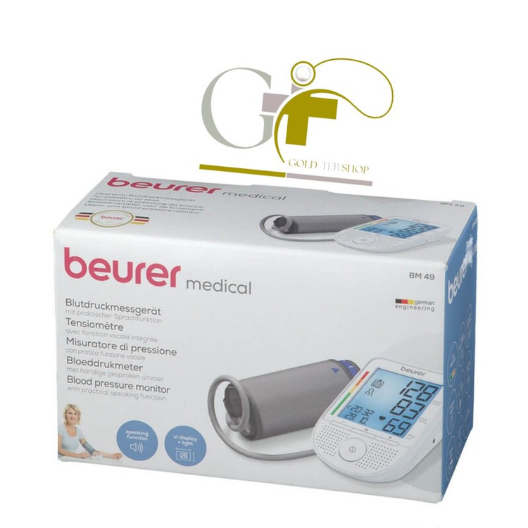 فشارسنج بازویی سخنگوی بیورر مدل BM49 Beurer BM53 Blood Pressure Monitor برند: بیورر نمونه ارتقا یافته و جایگزین BM53 کاف 36-22 سانتی متر دارای حافظه ی 60*2 سخن گفتن به 15 زبان اعلام آریتمی و خطر بروز سکته هشدار خطای اندازه گیری محصول آلمان مشخصات: وزن 620 گرم هشدار باتری ضعیف دارای حافظه ی 2 در60 اندازه کاف 36-22 سانتی متر دارای هشدار خطای اندازه گیری خاموشی خودکار دستگاه بعد از 3 دقیقه منبع تغذیه: باتری 4 عدد باتری قلمی 1.5 ولتی و یا برق شهری آداپتور AC (آداپتور به صورت جداگانه تهیه شود) 2 سال گارانتی شرکت آرمین درمان برند : بیورر